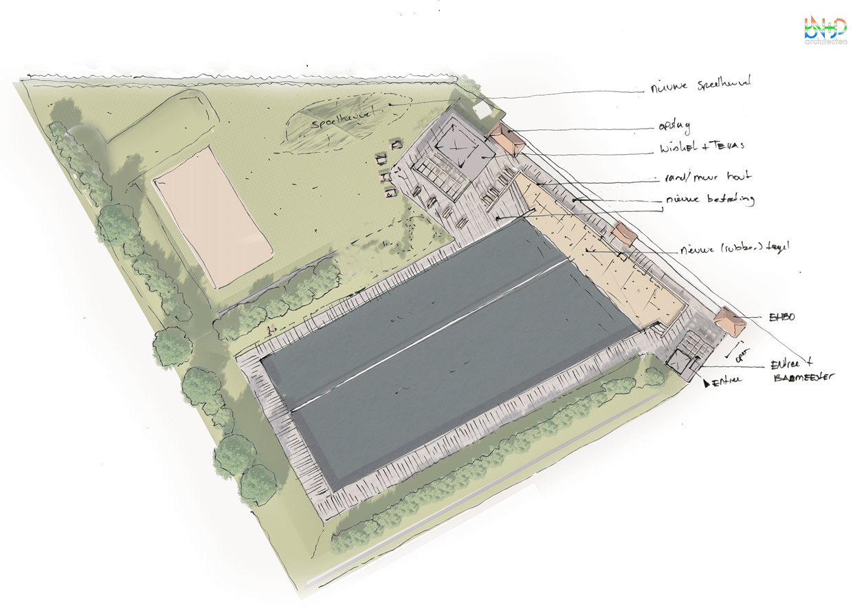 In het volgende deel gaan we wat meer specifiek in op lijn 4, de accomodatie. Zoals genoemd zijn we in verschillende samenstellingen (intern en extern) bezig geweest om ideeën te verzamelen en plannen te maken. Met betrekking tot de accomodatie zijn we tot 4 hoofdpunten gekomen. Deze 4 hoofdpunten voor de accommodatie zijn het vernieuwen van het straatwerk, vernieuwen speeltoestellen, dijk korter maken en het verplaatsen van de winkel en vernieuwen van de entree. Met onze wensen en ideeën zijn we naar BNJD architecten gegaan en zij zijn hiermee aan de slag gegaan. Ze hebben het zwembad in 3D gezet en daarbij hebben ze schetsen gemaakt zodat we een goede indruk krijgen van hoe het zou kunnen worden.