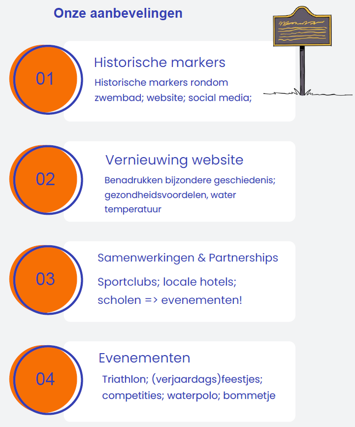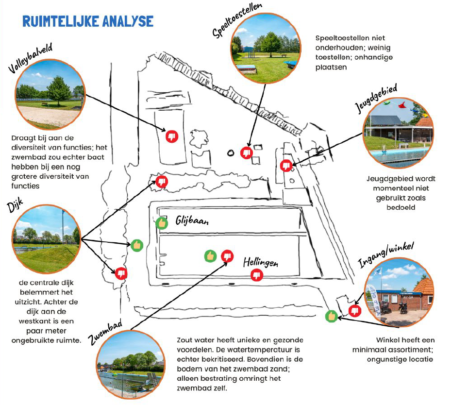 En een groep studenten van de RUG die de studie geografie doen. Deze groep heeft onderzoek gedaan naar de geografische componenten van het zwembad. Hoe ziet het er uit, waar is wat en vooral waarom? En hoe zou het ook kunnen. De uitkomst van dit onderzoek is een adviesrapport gekomen met een aantal voorstellen/ aanbevelingen en een ruimte analyse.