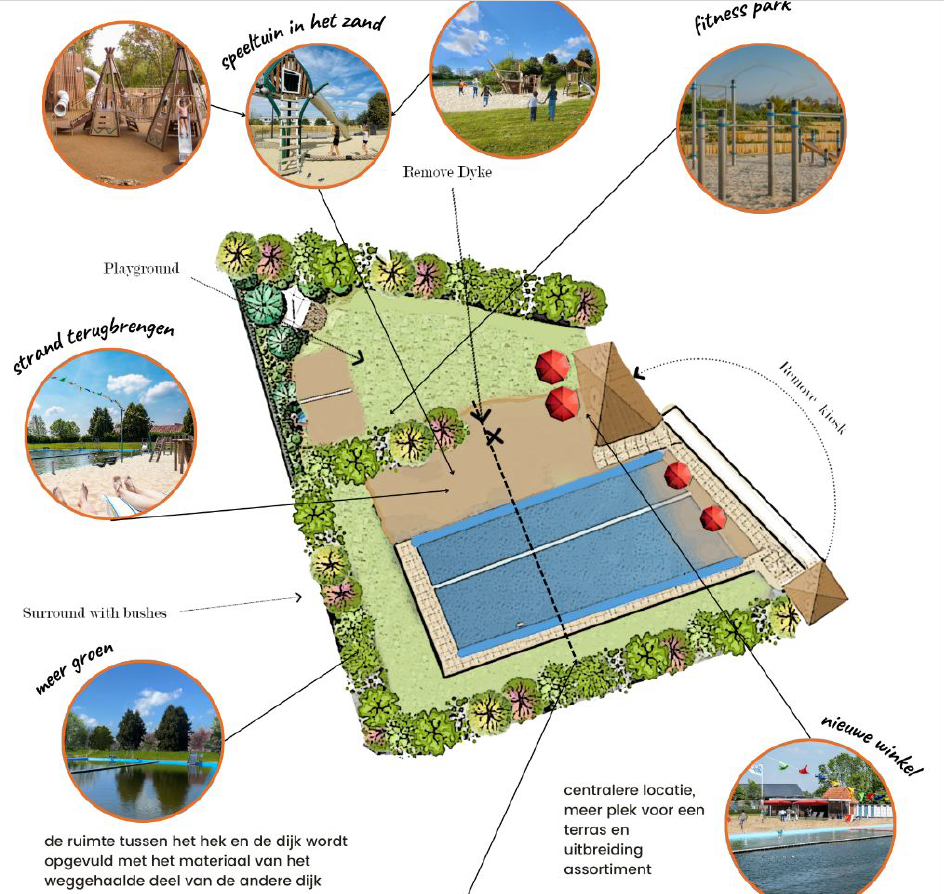 Door de dijk voor een gedeelte weg te halen wordt het speelveld veel meer bij het zwembad betrokken. Daarnaast zorgt het verplaatsen van de winkel ook voor een mooie plek voor een gezellig terras met goed zicht op zowel het zwembad als het speelterrein. Hierdoor wordt het ook veel aantrekkelijker om langer te recreëren maar ook om meer activiteiten (deels) op het speelveld te doen.